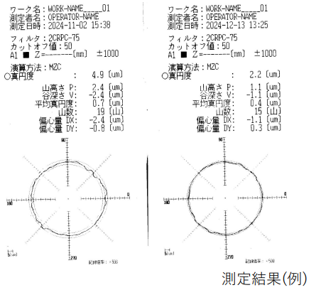 真円度の測定は、加工機械の性能や加工プロセスの安定性を評価する重要な指標です。工具の摩耗、工作物の取付方法、主軸の振れなどが真円度に影響を与えるため、測定結果をもとに工程の改善や補正が可能です。